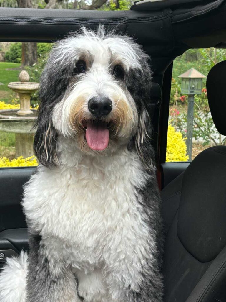 True story. About a month ago I was in the checkout line buying dog food when the woman behind me asked what kind of dog we had. “Bernadoodle” I said with a smile. Her face slid to an anguished look when she said, “A burnt doodle. How did that happen?”